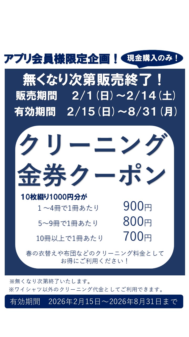 新着情報 2026/02/1金券販売中! 2026/02/1ウインターセール開催\(^o^)/ 2026/01/1新年初売り! 2025/12/22年末年始の休業案内 2025/11/21ブラックフライデー! 2025/11/1今年の汚れ!今年のうちに! 2025/10/1大好評!ワイシャツ回数券販売! 2025/08/2お盆休み 2025/08/1夏はウェット加工でスッキリ!サッパリ! 2025/07/1お待たせしました!サマーセールの開催です! 2025/07/1さあ夏休み!ご来客をお迎えする準備はお済ですか? 2025/04/26『ゴールデンウィーク休業日』のお知らせ 2025/04/1安心の防虫加工! 2025/04/150%OFF!! スーツ回数券販売開始! 2025/03/1ワイシャツ回数券販売中! 2025/03/1年に一度のダウン祭りスタート! 2024/10/26お預りBOXがお得です! 2024/09/7価格・サービス内容等、改定のお知らせ 2024/06/2布団キャンペーン開催中! 2024/04/1好評の防虫加工キャンペーン! 2024/01/1福袋キャンペーン 2023/12/17クリスマスキャンペーン開催 2023/10/28ハロウィンキャンペーンのお知らせ 2023/09/23適格請求書発行事業者の登録完了 2023/03/27大好評!安心のしまい込みセット 2022/11/1今年の汚れ、今年のうちに! 2022/07/28お盆休みのお知らせ 2022/04/28『ゴールデンウィーク休業日』のお知らせ 2022/04/8新サービス!【しまい込みセット】 2022/04/1効き目抜群!安心の防虫加工! 2022/03/1ダウンキャンペーン! 2022/01/1クリーニング福袋セール! 2021/04/28GW営業案内 2021/03/9『スニーカークリーニング』ご利用下さい! 2020/12/23正月休みのおしらせ 2020/11/1そろそろ大掃除の心構えを! 2020/08/28求人案内更新しました! 2020/08/7アプリで【らくらく宅配】バナー追加しました! 2020/08/5感染防止徹底宣言 2020/08/1夏です!ウェット加工の季節です! 2020/04/29アプリで「らくらく宅配」始めました! 2020/04/265月4日・5日、休業のお知らせ 2020/04/12営業時間変更のお知らせ 2020/01/29求人案内更新しました! 2019/12/24クリスマスキャンペーン! 2019/12/20年末年始の営業のお知らせ 2019/10/11臨時休業のお知らせ 2019/08/1お盆休みは13日~15日です。 m(__)m 2019/06/1効き目抜群!やってて良かった撥水加工! 2019/04/20ゴールデンウイークも休まず営業! 2019/04/8春ですね~w!衣替えですよ! 2019/04/1春ですね~w!衣替えですよ! 2019/03/29しまい洗いに最適!ワンランク上の洗い! 2019/03/25春ですね~w!衣替えですよ! 2019/03/13お客様の声から生まれた新サービス! 2019/02/27インスタグラム、Facebook始めました! 2019/02/2リニューアルオープン! 2019/01/19当社の経営革新計画が承認されました! 2018/10/30ハロウィンキャンペーン開催!! 2018/09/1消費税外税外税扱いへ変更のお知らせ 2018/04/8絶好の衣替えのチャンス! 2018/03/28春だ!桜だ!衣替えだ!! 2018/03/1大好評!ワイシャツ回数券販売開始! 2018/02/7ウインターセールの開催です! 2018/01/1福袋販売開始! 2017/11/4大好評!ワイシャツ回数券販売開始! 2017/08/1お盆休みのお知らせ 2017/07/14いよいよ新サービス開始! 2017/07/3お待たせしました!サマーセールの開催です!!! 2017/07/1さあ夏休み!ご来客をお迎えする準備はお済ですか? 2017/06/2残りわずか!保管受付スタート! 2017/05/5メール会員限定セール開催中! 2017/04/21メール会員限定セール開催! 2017/04/1毛布・寝具類 キャンペーン! 2017/03/31新サービス「保管」スタート! 2017/03/31メール会員限定セール開催! 2017/03/24年に1度のダウン半額キャンペーン!あと2日! 2017/03/1「金券」販売開始! 2017/02/7便利な保管サービス 2017/02/7ウインターセールのお知らせ! 2017/02/7ウインターセールのお知らせ! 2017/02/7ウインターセールのお知らせ! 2017/01/1服袋キャンペーンのお知らせ 2017/01/1あけましておめでとうございます。 2016/12/29アンケートお礼 2016/12/27年末年始の営業案内 2016/12/23Xmasキャンペーン開催中! 2016/11/1今年の汚れ、今年のうちに! 2016/10/3安心の防虫加工! 2016/09/21会社案内 更新しました。 2016/09/21求人案内 更新しました。 2016/09/13HP更新しました!(イドカバネットのリンクと求人案内の動画添付) 2016/09/1サッパリ・スッキリ!夏の汗には、ウェット加工がおススメ! 2016/08/26子供たちが工場見学に来ました! 2016/08/26動画コンテンツ更新しました! 2016/08/19お盆休みの衣類をまとめてお洗濯! 2016/08/1ワイシャツ回数券販売中! 2016/08/1お盆休みのおしらせ 2016/07/20お待たせしました!!サマーセールの開催です!!! 2016/07/11お待たせしました!!サマーセール開催です!!!